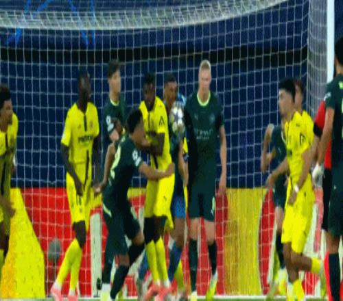 第4分钟,哈兰德抢点头槌,皮球偏出立柱