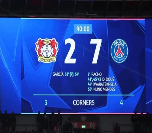 7比2客场横扫勒沃库森的大巴黎,毫无疑问是第3轮欧冠进球创纪录的旗手。这个7比2的大胜追平了大巴黎欧冠联赛队史的单场最大比分胜绩,此前是2000/01赛季小组赛第5轮主场7比2大胜挪威的罗森堡,以及2022/23赛季小组赛第5轮主场7比2海法马卡比,但同样比分的比赛含金量,显然不如这次客场横扫德甲豪门勒沃库森。