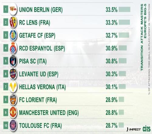 CIES(瑞士足球天文台)统计了五大联赛球队在攻防转换阶段球队进攻时间的占比排行。通俗说,在球权转换阶段,球队可以选择回传或者横传控制球权,也可以立即发起进攻。在这项统计中,柏林联合占比最高,曼联排名第九,是英超打转换最直接干脆的球队。