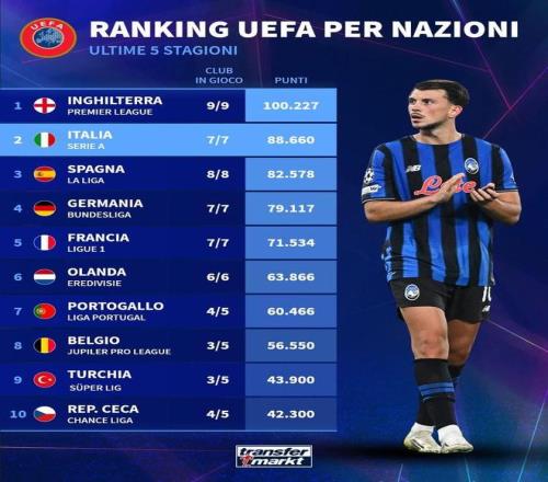 各联赛欧战积分排名:英超居首,意甲&西甲&德甲分列二到四位