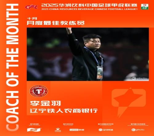 11月27日宣 辽宁铁人主帅李金羽在10月四战全胜的出色表现下,荣膺中甲联赛10月最佳教练称号。球队在该月的表现可圈可点,打入8球,仅失1球,成为唯一一支全胜的球队,展现了强大的竞争力。