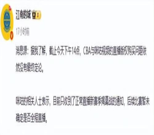 媒体人江南的城昨天报道:据我了解,截止今天下午14点,CBA与咪咕视频的直播版权购买问题依然没有最终定论。咪咕的相关人士表示,目前只收到了正常直播新赛季揭幕战的通知,后续比赛暂未确定是否全程直播。这就让球迷失望了,虽然央视每一天只直播一场,但是大部分场次我们看不了直播,只能有文字直播。也许最终CBA公司能与咪咕谈妥直播权问题,我们就等待吧。但是究竟哪天谈妥,真是心里没有底。