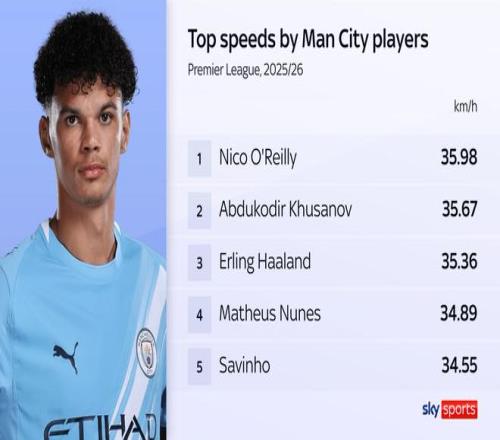 时速35.98km,奥赖利创造曼城本赛季最快冲刺速度
