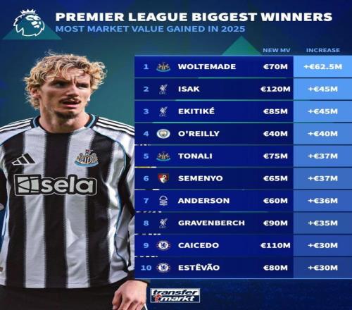 北京时间12月25日,德转列出了英超球员中2025年涨幅最高的10名球员,今夏加盟纽卡斯尔联的沃尔特马德过去这一年里身价暴涨6250万欧元高居第一,伊萨克和埃基蒂克上涨4500万欧元并列第二。