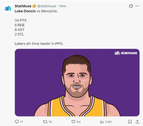 东契奇在场湖人的防守效果再一次让人无奈,从领先11分到落后4分只用了4分钟不到,美媒Bracco已经晒出东胖子的图老嘲讽东契奇了,半场东契奇8中2+三分4中0拿13分4篮板4助攻2抢断4失误。