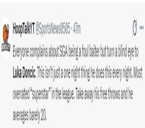 美媒HoopTalkYT:每个人都抱怨SGA是一个罚球贩子但对东契奇视而不见,东契奇并不是只有一个夜晚罚球多,他其实是联盟最被过度吹捧的超巨之一,如果不考虑他的罚球场均就20分左右。