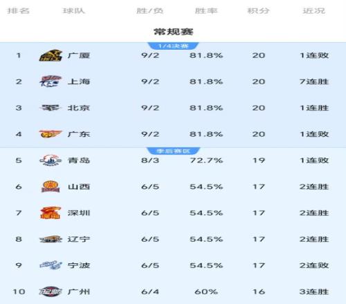 CBA狂欢夜!北京追平广厦广东辽宁大胜升第8前总冠军11连败垫底