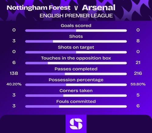 北京时间1月18日,阿森纳在客场0-0闷平诺丁汉森林。据数据统计机构Suqawka统计,本场比赛上半场阿森纳共射门8次,却无一射正。
