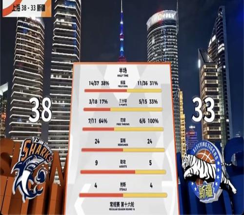 随后大鲨鱼外援古德温开始发力,大号三分命中吹响球队反攻的号角,古德温这一节4投全中,独砍11分。在他的带领下,上海男篮打出一个11比0,反超比分。而新疆男篮第二节19次出手仅仅投进5球。大鲨鱼单节打出25比16,在半场结束时以38比33领先5分。