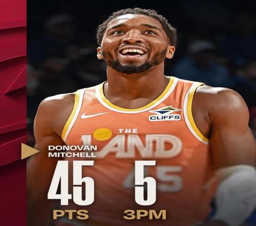 这场比赛,骑士当家球星米切尔再度发挥出色:全场出战35分钟,投篮25中15,三分8中5,罚球12中10,拿下45分4篮板4助攻1抢断。