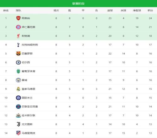 本赛季欧冠联赛阶段最稳的球队阿森纳,8战全胜,直接锁定榜首。