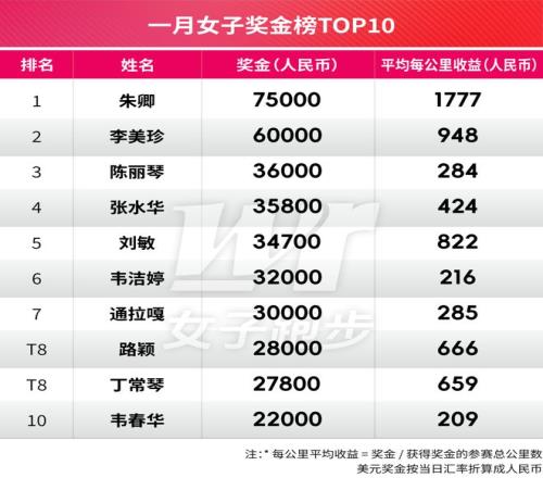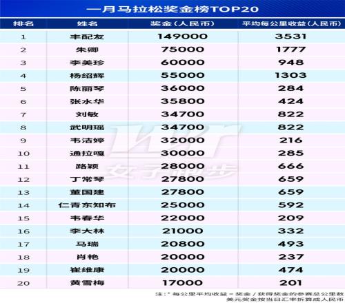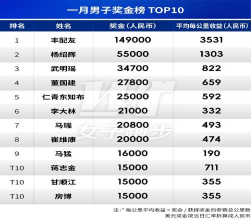 奖金榜计算了每公里平均收益,反映了运动员奖金收益的效率,部分运动员参赛频次虽然低,但是参加大赛并获得较高名次,每公里收益就高,而部分运动员频繁参加小型比赛,平均收益就相对较低。一月女子运动员平均收益最高的是朱卿,她只参加了重马一场比赛,但获得国内女子第一且突破了230,获得了有门槛的(成绩突破230)国内第一7.5万人民币奖金,而不是国际第三的1万美元;男子收益最高的是丰配友,不但获得了国际男子第二,拿走2万美元奖金,而且拿到了破国内赛会纪录的1万人民币奖励,每公里收益达到惊人的3531元。男子榜单上蒋金志在半马中夺冠并打破赛会纪录,获得5000元奖金和1万元破赛会纪录奖励,因此平均每公里收益也较高。