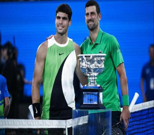 当地时间2月1日,在澳大利亚墨尔本进行的2026年澳大利亚网球公开赛男子单打决赛中,西班牙选手阿尔卡拉斯对阵塞尔维亚选手德约科维奇。 新华社发(王申摄)