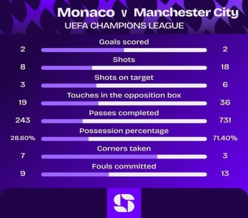 欧冠联赛阶段第二轮,曼城做客挑战摩纳哥。哈兰德首开纪录,特泽远射世界波扳平比分,哈兰德头球再度帮助曼城领先。常规时间最后时刻,尼科·冈萨雷斯抬脚过高送点,埃里克·戴尔罚入点球,摩纳哥完成绝平。最终两队2比2握手言和。