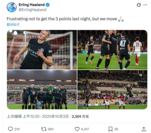 哈兰德更新社交媒体写道:“昨晚没能拿到三分很沮丧,但我们会继续前进。”