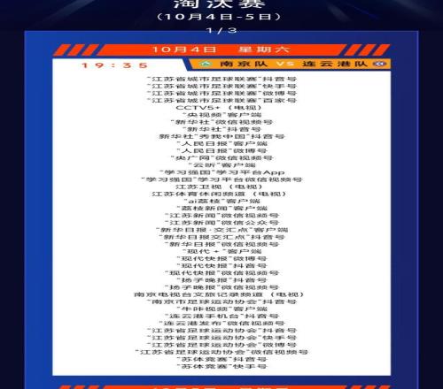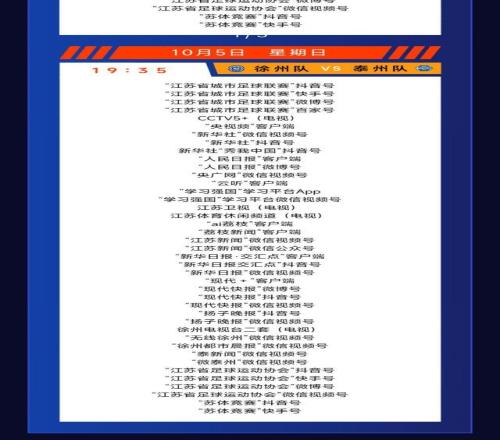 现代快报讯(记者 王卫)10月4日、5日、7日、8日,苏超八强淘汰赛将在国庆中秋双节假期期间激战四场。10月3日,苏超官方微信公众号发布了淘汰赛(10月4日-5日)转播计划表,现代快报记者注意到,10月4日晚南京对阵连云港、10月5日晚徐州对阵泰州的比赛,CCTV5+(电视)均转播。记者了解到,这是央视电视端首次直播苏超赛事。