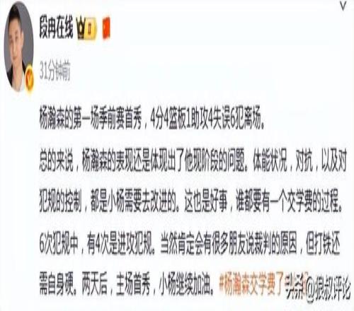 这也是好事,谁都要有一个交学费的过程。6次犯规中,有4次是进攻犯规。当然肯定会有很多朋友说裁判的原因,但打铁还需自身硬。两天后,主场首秀,小杨继续加油。”