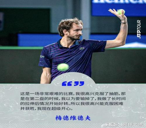 经过简单的场上拉伸缓解,梅德韦杰夫带着明显的不适坚持作战,抢七中只拿到一分,丢掉了第二盘。决胜盘中,他展现出冠军球员的韧性和经验,顶住压力和身体不适,在关键的第9局完成致命破发,最终锁定胜局。