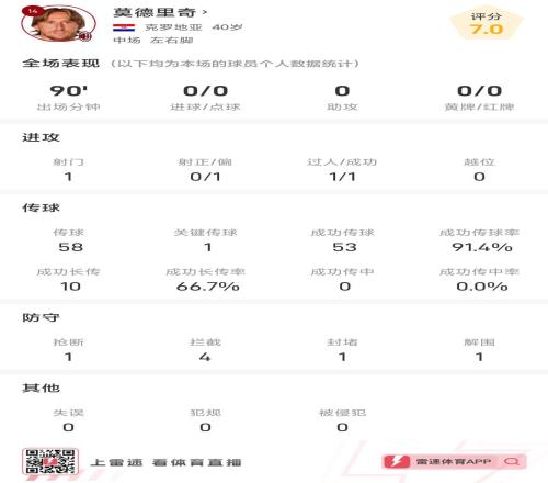 雷速体育9月29日宣 本轮意甲焦点大战,米兰在十人应战的情况下2-1力克卫冕冠军那不勒斯,取得四连胜登顶意甲榜首。40岁的莫德里奇首发出战并打满全场。本场比赛莫德里奇表现