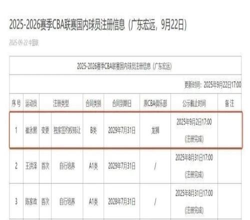 9月22日傍晚,CBA官网更新了2025-2026赛季CBA联赛国内球员注册信息。其中广东宏远已成功为崔永熙完成注册,并与其签下四年B类合同,合同将于2029年7月31日到期。今夏,广东男篮社媒