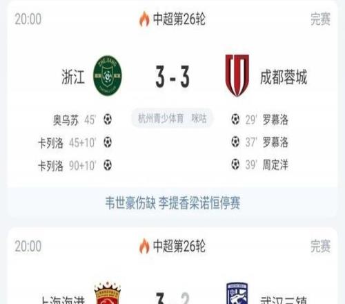 北京时间9月26日,中超第26轮先赛4场。最终,卫冕冠军上海海港在主场读秒绝杀,3-2逆转击败武汉三镇;而成都蓉城则痛失好局,在客场一度3-0领先的他们,崩盘连丢3球遭浙江队绝平,丢掉榜