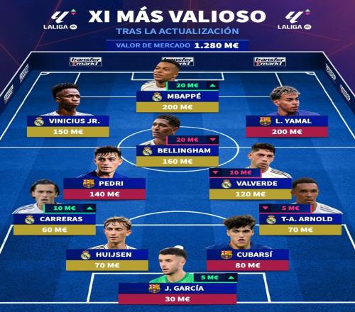 12月12日,德转更新了西甲球员的身价,并且列出最贵首发阵容。身价两亿欧的姆巴佩、亚马尔领衔,皇马和巴萨包揽11个位置,阵容总身价高达12.8亿欧。德转列西甲最贵阵容门将:霍安-加