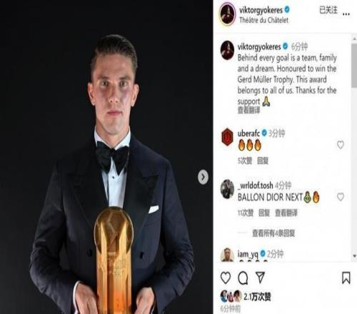 直播吧9月24日宣 阿森纳前锋约克雷斯更新社媒动态,晒出自己与盖德-穆勒奖杯的合照。约克雷斯获得2025年盖德-穆勒奖(最佳前锋),他在社交媒体上晒出手捧奖杯的照片,并写道:“每一个