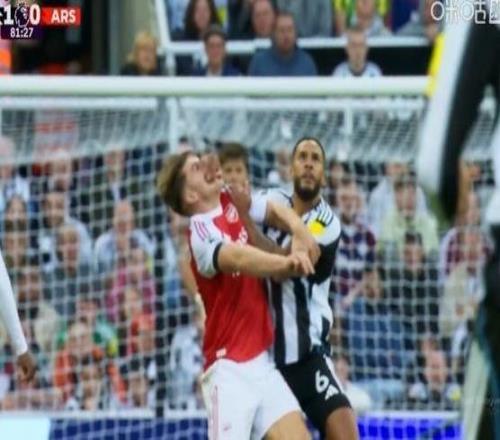直播吧09月29日宣 阿森纳vs纽卡第82分钟,约克雷斯禁区内被拉塞尔斯按脸放倒,裁判未作判罚!独家看英超就在咪咕