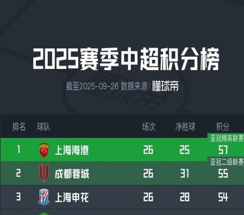 争冠悬念再起!中超积分榜:申花&海港&蓉城&国安列前4,仅差3分