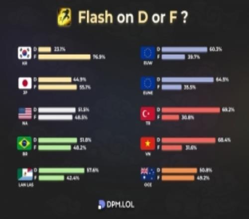 体育资讯9月25日称 数据网站DPM统计,各个服务器D闪和F闪玩家的比例; 其中韩服F闪玩家高达76.9%,D闪占23.1%;而EU欧洲 TR土耳其 VN越南等服务器的