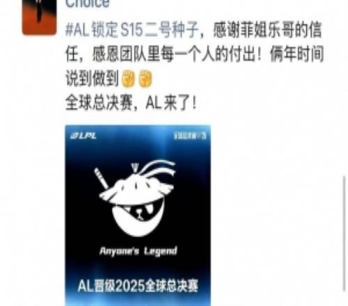 体育资讯9月21日称 随着BLG战胜TES夺得冠军,AL以二号种子身份晋级世界赛,AL经理爱笑更新朋友圈: 感恩团队里每一个人的付出,全球总决赛AL来了!