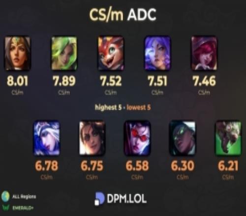 体育资讯10月1日称 根据国外数据网站DPM.LOL统计,当前版本每分钟补刀数最高及最低的ADC: 希维尔最高8.01,老鼠最低6.21。