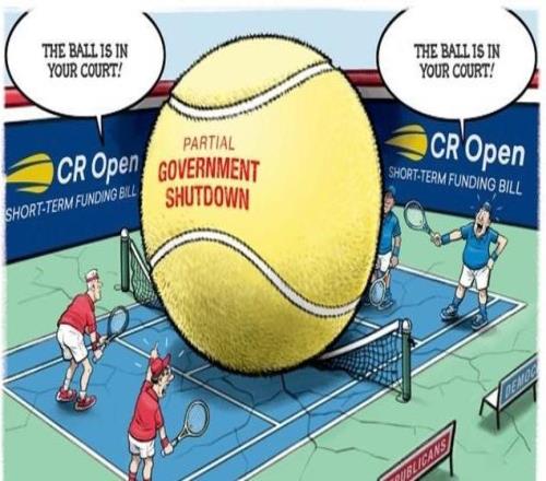 参考消息网9月28日报道在“短期支出法案”公开赛的赛场内,“政府部分关门”的网球压在球场中间,代表美国两党的选手互相指责:“球在你那边!”(原载美国政治漫画网站)