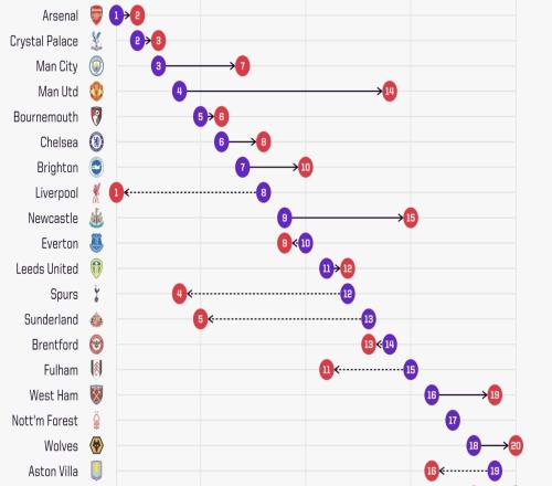 雷速体育10月1日宣 今日,国外知名数据机构公布了一项英超联赛前六轮预期积分排名的数据结论,其中目前位列榜首的利物浦期望排名仅位列第八,而排名第二的阿森纳期望排名是英超