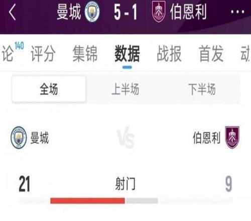 曼城51伯恩利全场数据:射门219,射正82,得分机会50