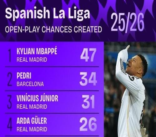 本赛季至今西甲运动战创造机会榜:姆巴佩居首,佩德里第二