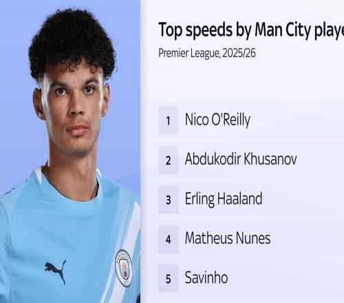 时速35.98km,奥赖利创造曼城本赛季最快冲刺速度