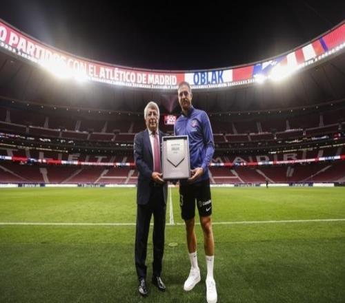 直播吧9月25日宣 欧冠联赛阶段第1轮,马竞对阵利物浦的比赛,球队门将奥布拉克完成了代表马竞出战500场的里程碑。今日,马竞官方晒图,球队主席塞雷佐向奥布拉克颁发了代表球队出战