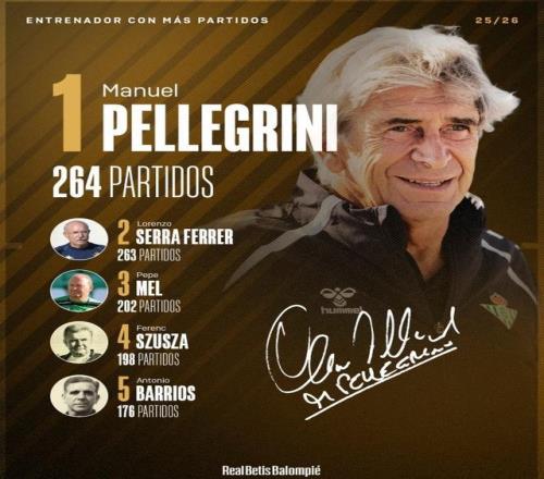 264场,佩莱格里尼成为贝蒂斯队史执教场次最多的主教练
