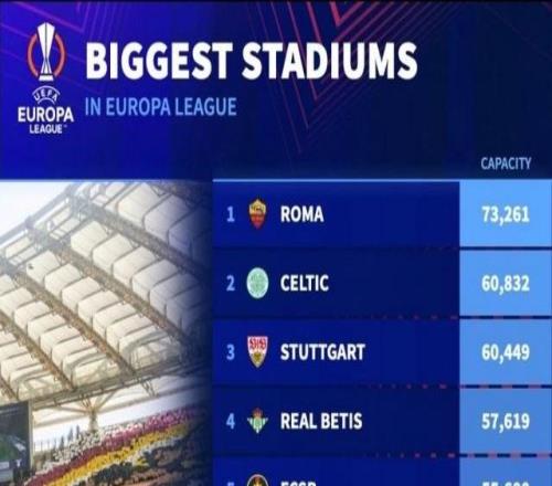 本赛季欧联杯球队主场最大容量榜单:罗马居首,凯尔特人次席