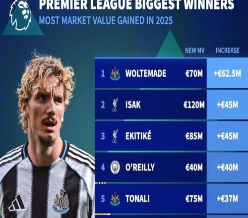 北京时间12月25日,德转列出了英超球员中2025年涨幅最高的10名球员,今夏加盟纽卡斯尔联的沃尔特马德过去这一年里身价暴涨6250万欧元高居第一,伊萨克和埃基蒂克上涨4500万欧元并
