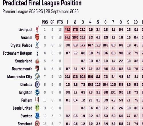雷速体育9月29日宣 新赛季英超联赛进行到第6轮,国外数据机构使用超级计算机更新了对本赛季最终积分榜的预测,利物浦仍以46.5%的夺冠率位居第一。本轮比赛,利物浦客场1-2被水晶