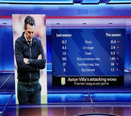 直播吧9月22日宣 在本轮英超,维拉1-1战平桑德兰。这是维拉本赛季5轮英超打进的唯一进球,BBC也盘点了维拉本赛季英超相较上赛季的场均进攻数据,可谓全面下滑,具体如下:上赛季vs本
