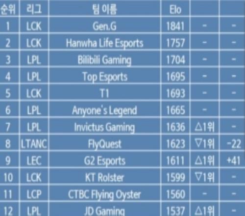 韩网战队战力榜:GEN第一HLE第二BLG第三TES第四IG排名第七